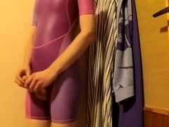 young boy in shiny leotard showing, masturb and cum on foot