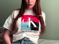 Pale teen ladyboy in jean shorts strips and jerks off by