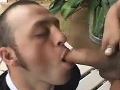 Redhead ladyboy wanks outdoors while giving oral pleasure